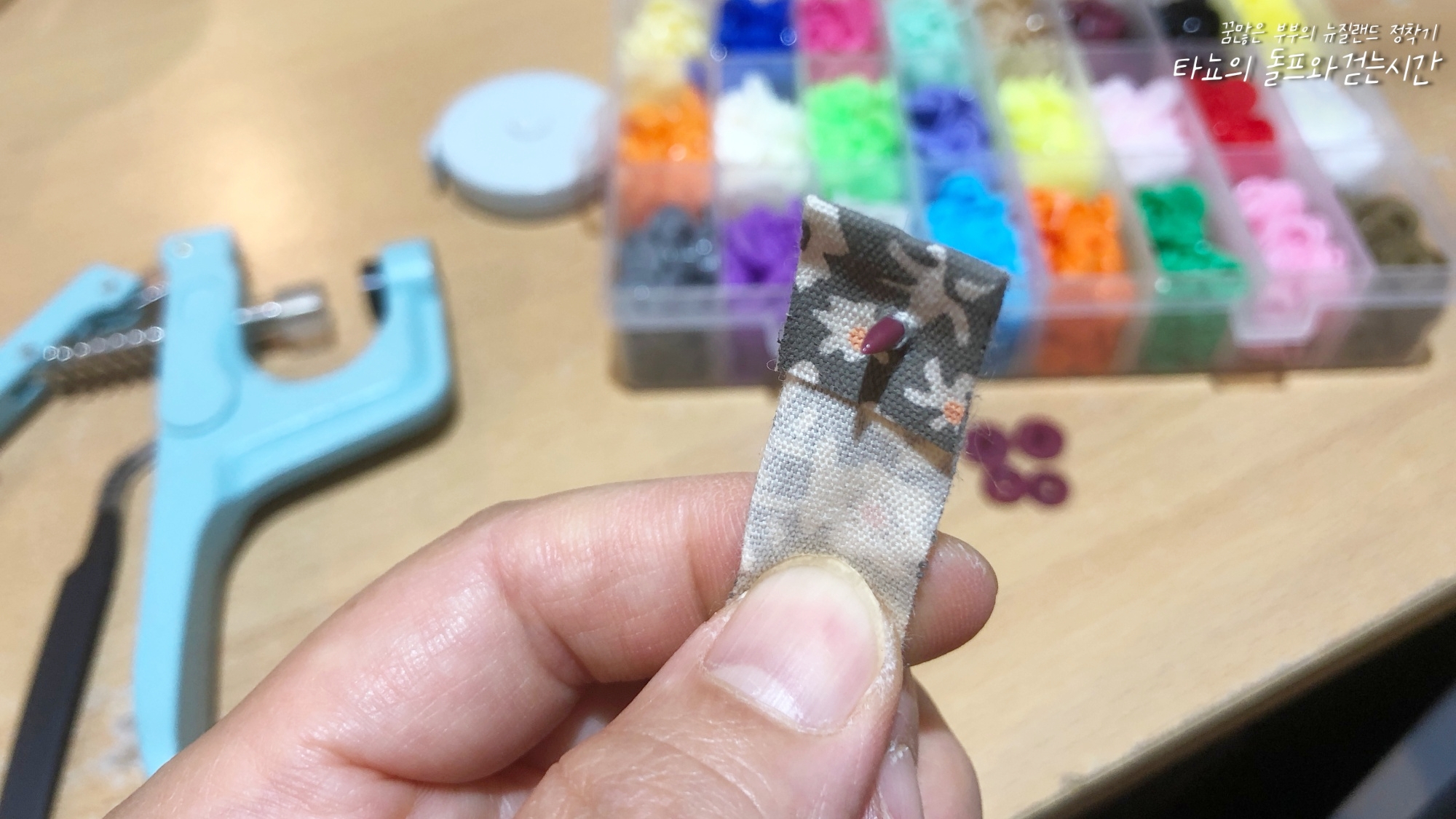 한국에서는 똑딱이 단추로 불리고 있는 T단추는 종류가 많았는데 크게는 금속 단추와 플라스틱 단추로 나뉘었다. 일단 나는 금속 알러지가 있기 때문에 무조건 플라스틱으로 선택했다. 생각보다 T단추를 사용할 곳이 많았다. 겨울이면 목에 손수건을 종종 감는 편인데 T단추를 달아서 사용하면 편할 것 같아서 달기도 했고 이불 단추의 간격이 너무 넓어서 불편했던 이불 커버에도 T단추를 달아줬다.