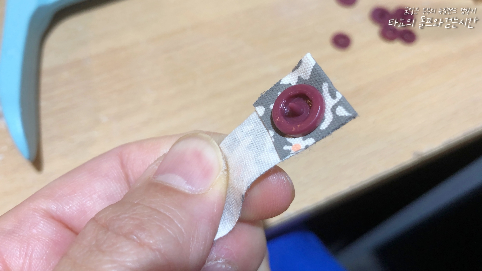 파인 단추를 먼저 달았으니 이제 돌출형 단추를 달아보자. 송곳으로 위치를 잡아주고 압정 모양의 뾰족이를 끼운 다음 돌출형 단추를 끼웠다.