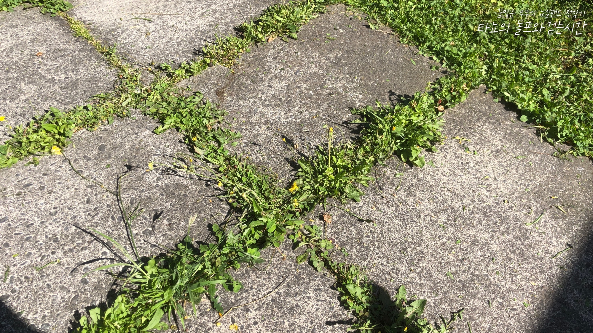 타일 사이사이로 올라온 거침없는 잡초들의 모습이다. 부동산에서 인스펙션 나오면 이런 부분을 굉장히 많이 지적한다. 어떤 사람들은 타일 사이로 제초제를 뿌려서 아예 죽이기도 하는데 그러면 그 사이가 누렇게 색깔이 변한다. 나는 또 그런 건 싫더라고. 일단 초록이 좋다.