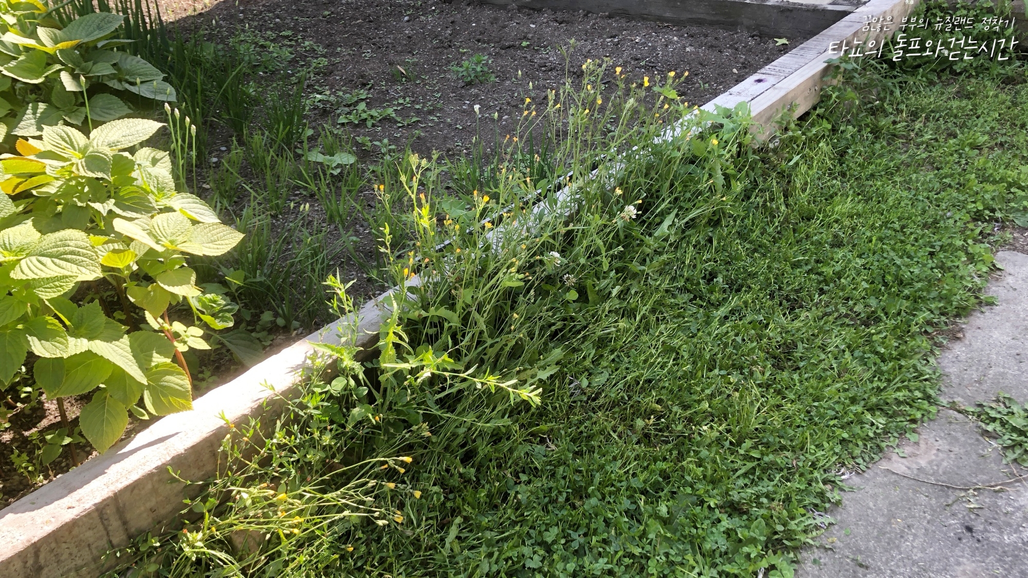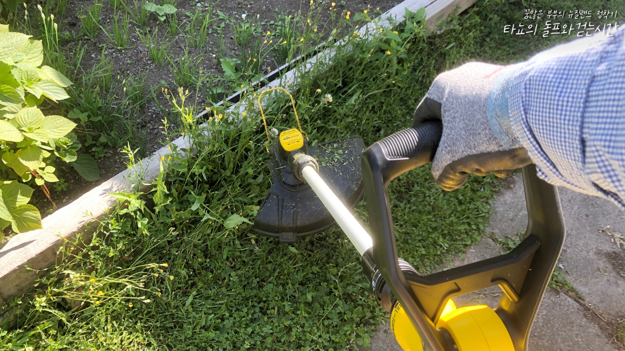 신랑이 앞마당의 넓은 잔디를 작업할 때 나는 예초기를 들고 텃밭이 있는 뒷마당으로 간다.