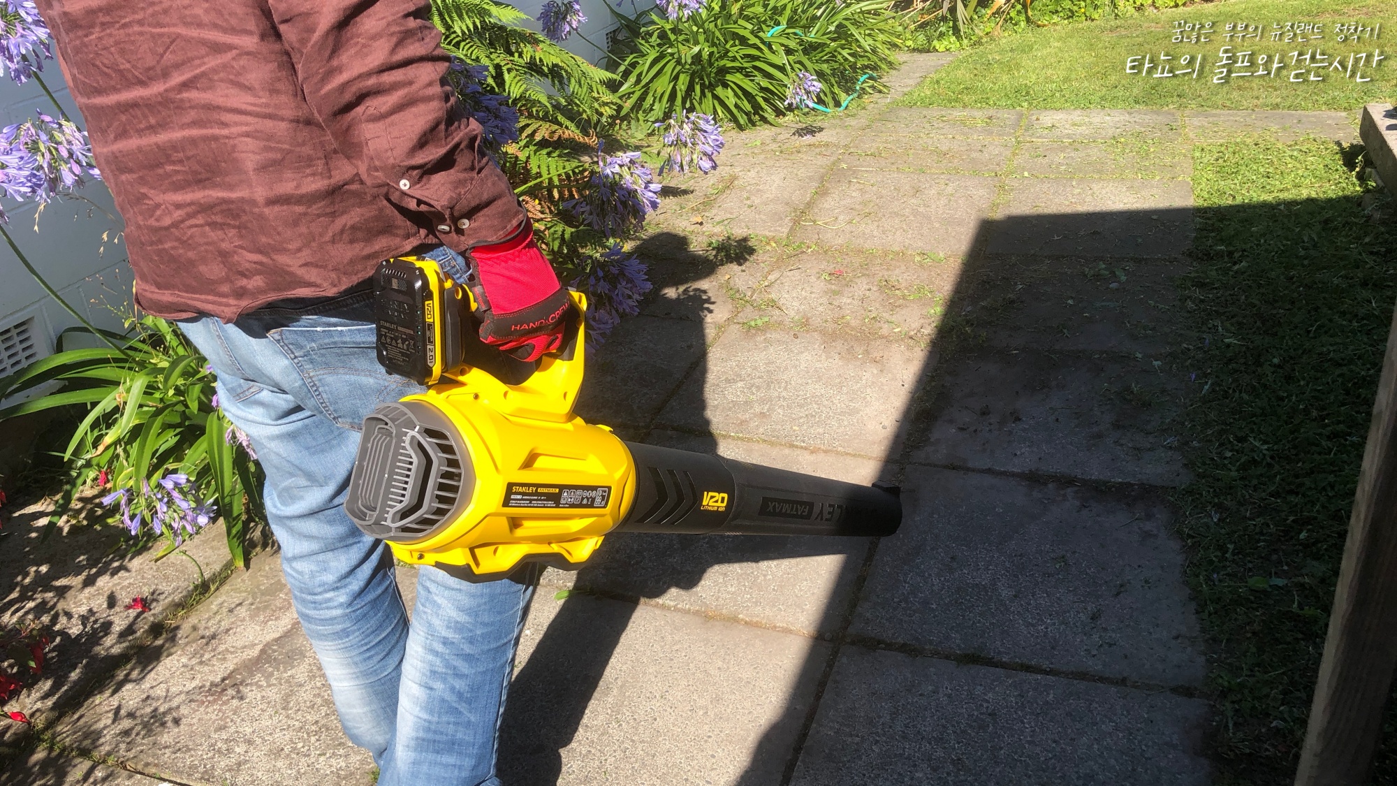 사진으로 살짝 보이지만, 내가 사용하는 예초기는 잔디 쓰레기를 빨아들이는 기능은 없기 때문에 바닥이 조금 지저분하다. 그래서 블로워로 청소를 해야 깔끔하게 정리가 된다. 이게 없으면 빗자루로 쓰는 것도 방법이다. 블로워도 스텐리 제품인데 두 녀석이 서로 배터리 호환이 가능해서 더 효율적으로 사용하고 있다.