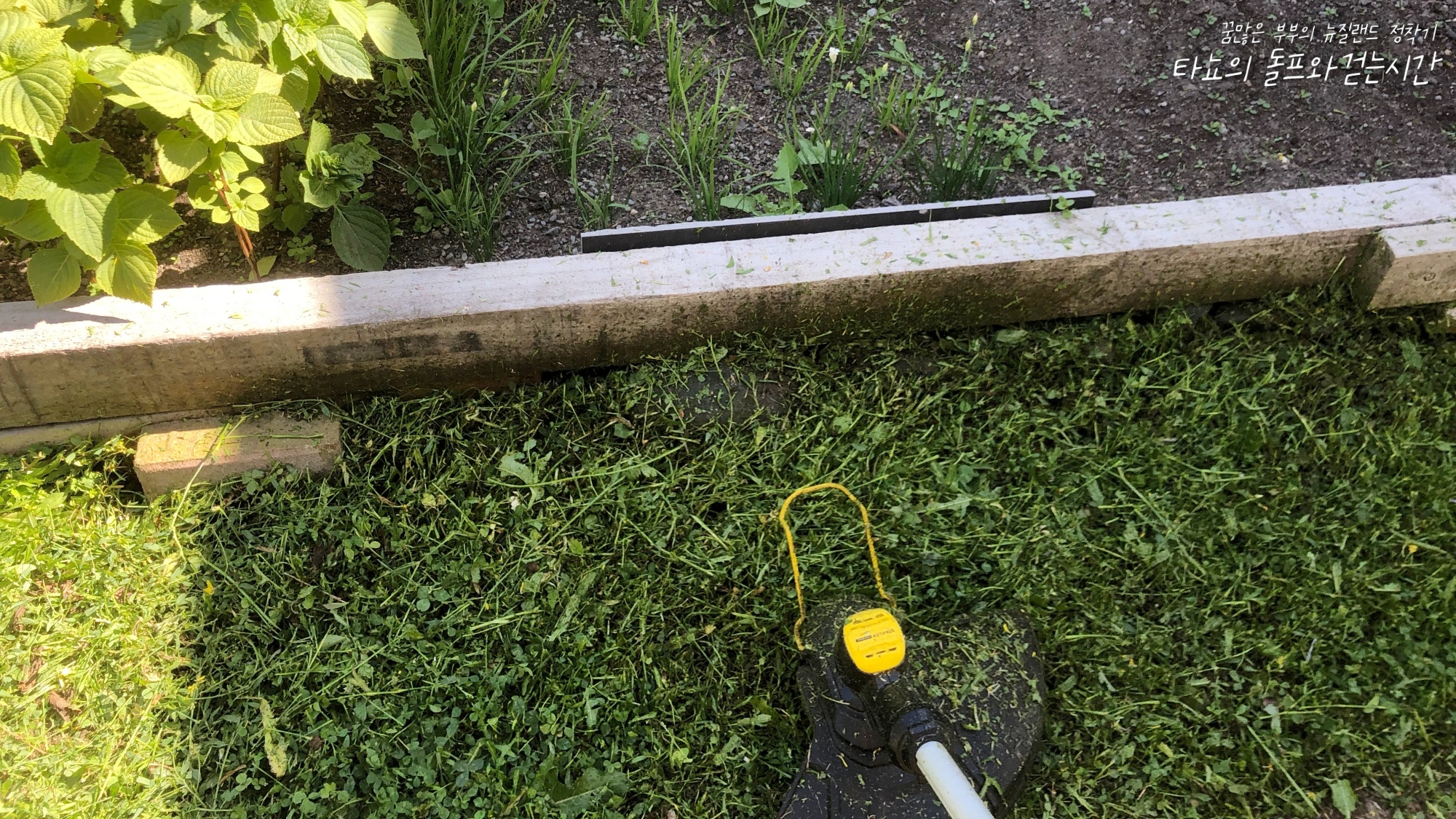 예초기를 돌리고 블로워로 청소를 한 뒤 깔끔하게 정리된 모습이다. 타일 사이로 초록이 보이는 게 역시 좋다. 예전에는 신랑 혼자 잔디깎이를 밀고 나는 그 모습을 지켜보기만 했었는데, 이제 서로 일을 나눠서 하게 되니 더 좋다.