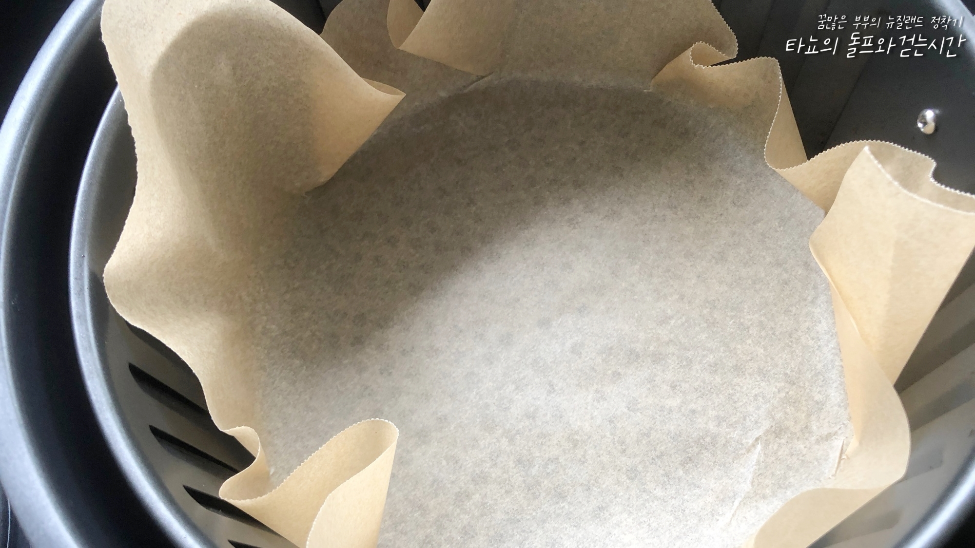 나는 에어프라이어를 사용했다. 에프가 없다면 오븐에 살짝 굽거나 프라이팬에 구워도 된다. 쿠킹 페이퍼를 깔고 사용했다.