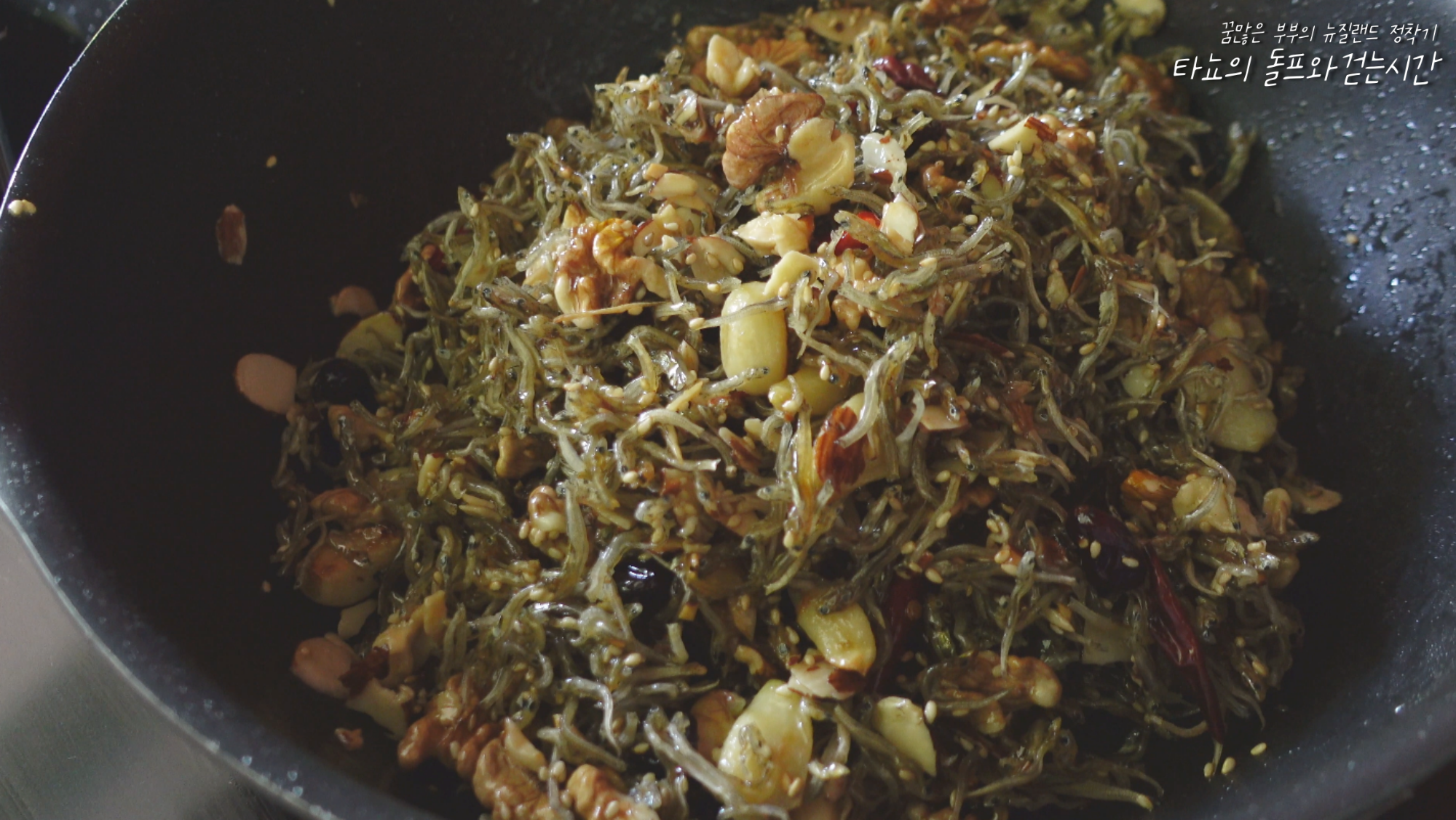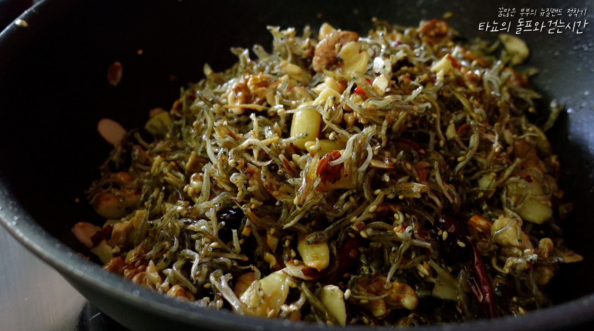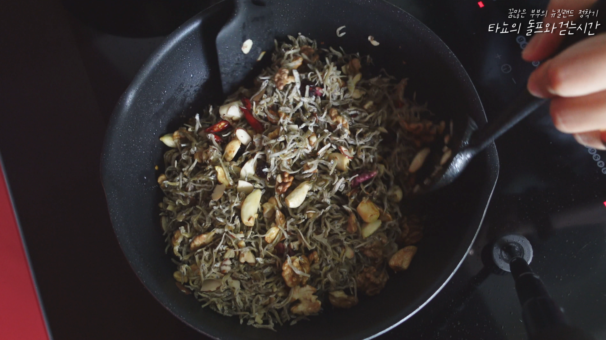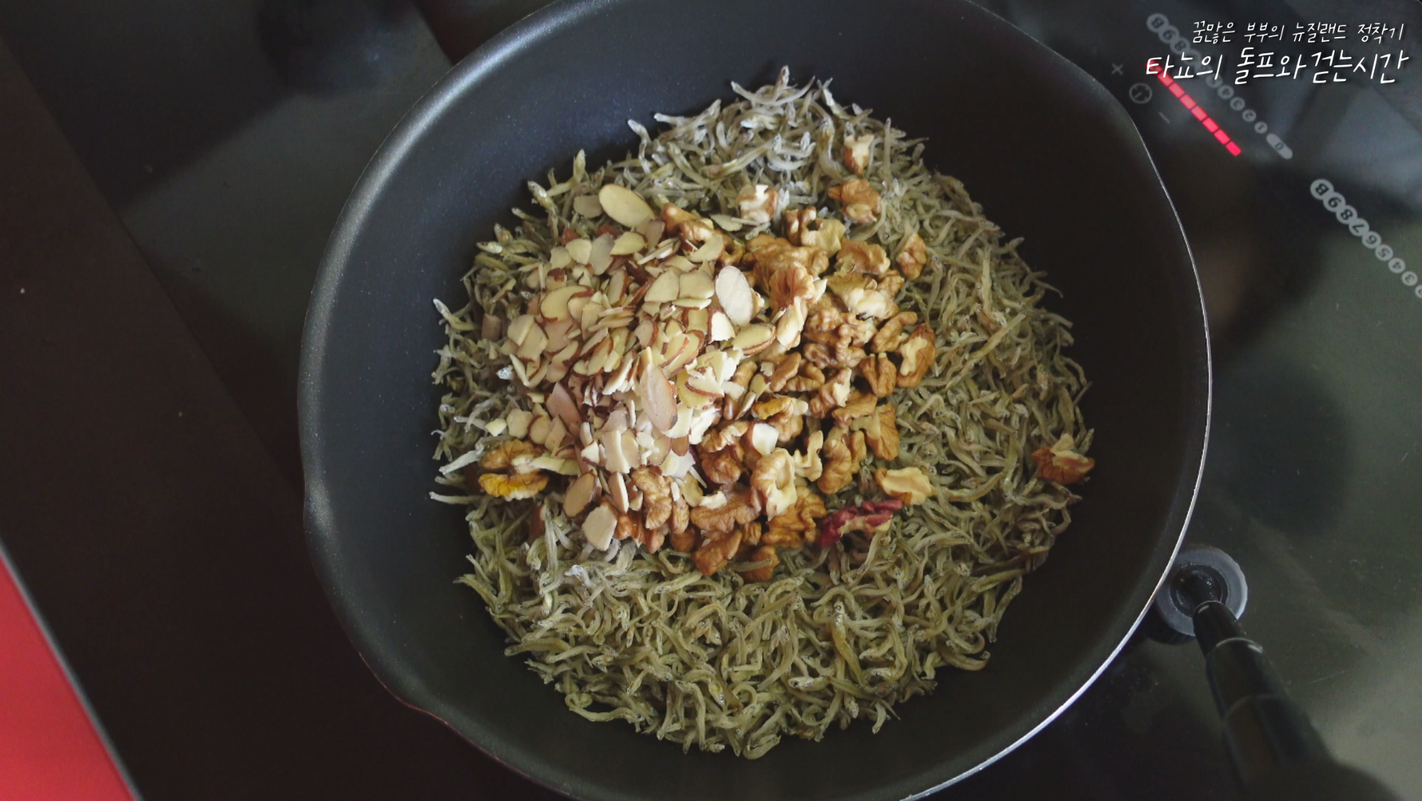 예열한 팬에 멸치와 호두, 아몬드를 몽땅 넣은 뒤 볶아주며 수분기를 날려준다. 이때는 식용유를 두르지 않는다. 멸치와 견과류를 따로 볶는 사람도 있는데 어떻게 볶든 중요하지 않다. 그저 수분만 잘 날리면 된다.