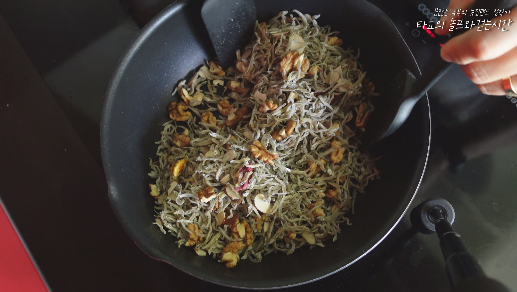 예열한 팬에 멸치와 호두, 아몬드를 몽땅 넣은 뒤 볶아주며 수분기를 날려준다. 이때는 식용유를 두르지 않는다. 멸치와 견과류를 따로 볶는 사람도 있는데 어떻게 볶든 중요하지 않다. 그저 수분만 잘 날리면 된다.