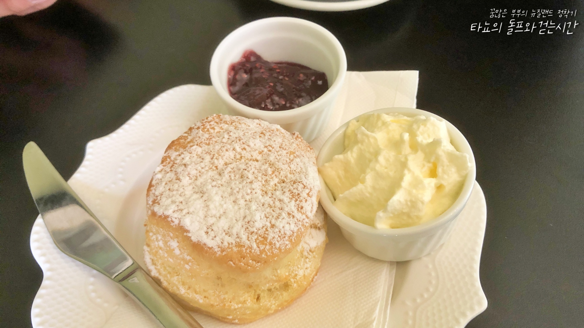친구가 추천했던 스콘을 주문하고 사진에는 없지만 아몬드 크로와상을 주문했다. 신랑은 플랫 화이트, 나는 아메리카노를 주문했는데 신랑 커피 꼴이 말이 아니었다. 바리스타로 살아온 세월이 반평생이라 이런 것만 눈에 보인다. 그래도 원두가 좋아서 맛은 선방했다. 뉴질랜드에서 만나는 스콘은 조금 퍽퍽한 감이 있는데 여기 스콘은 한국 KFC에서 사 먹던 비스킷 같은 식감과 맛이 났다. 크림과 딸기잼을 함께 발라 먹으니 세상 맛있더라.