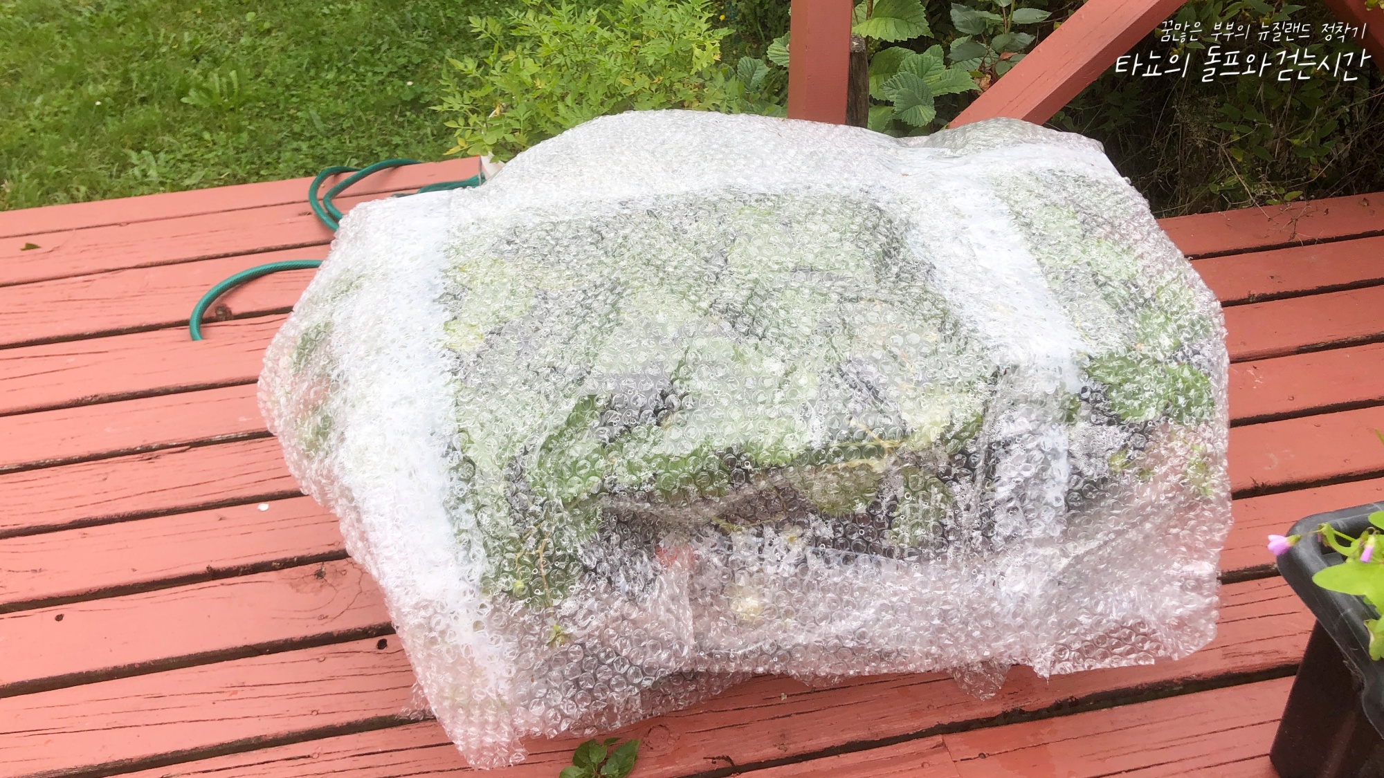 요즘 찬바람이 살살 불기 시작해서 딸기 박스에 비닐 옷을 지어 입혔다. 마이터텐이나 버닝스 같은 곳에 가면 농사에 쓰이는 비닐도 팔지만, 굳이 저거 하나 덮자고 돈 주고 비닐 사는 게 아까워서 집에 놀고먹는 뽁뽁이 짜깁기 해서 덮었다. 비닐은 또 뭘로 고정시키나 고민하다가 곱게 모아둔 고무줄 잘라 엮어다가 쏙 끼워줬다. 고무줄 2미터는 엮은 것 같다. 어쨌든 효과는 만점.
