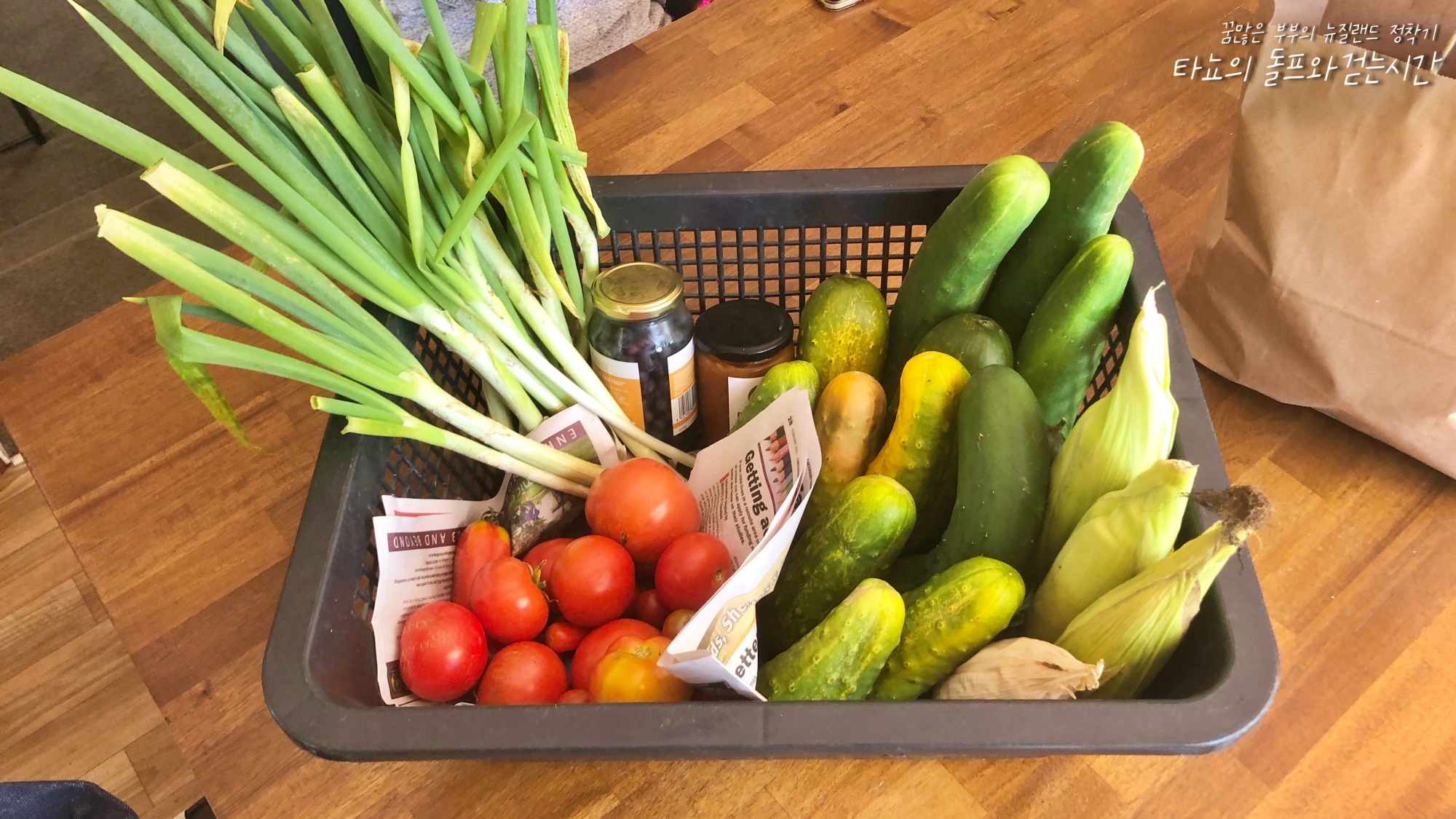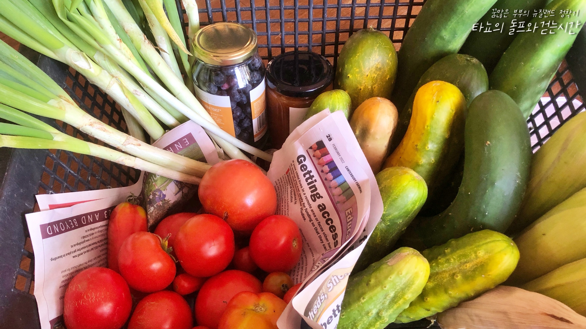 대파, 토마토, 오이, 옥수수, 감자, 수제 토마토 랠리쉬, 블루베리를 잔뜩 담아왔더라.