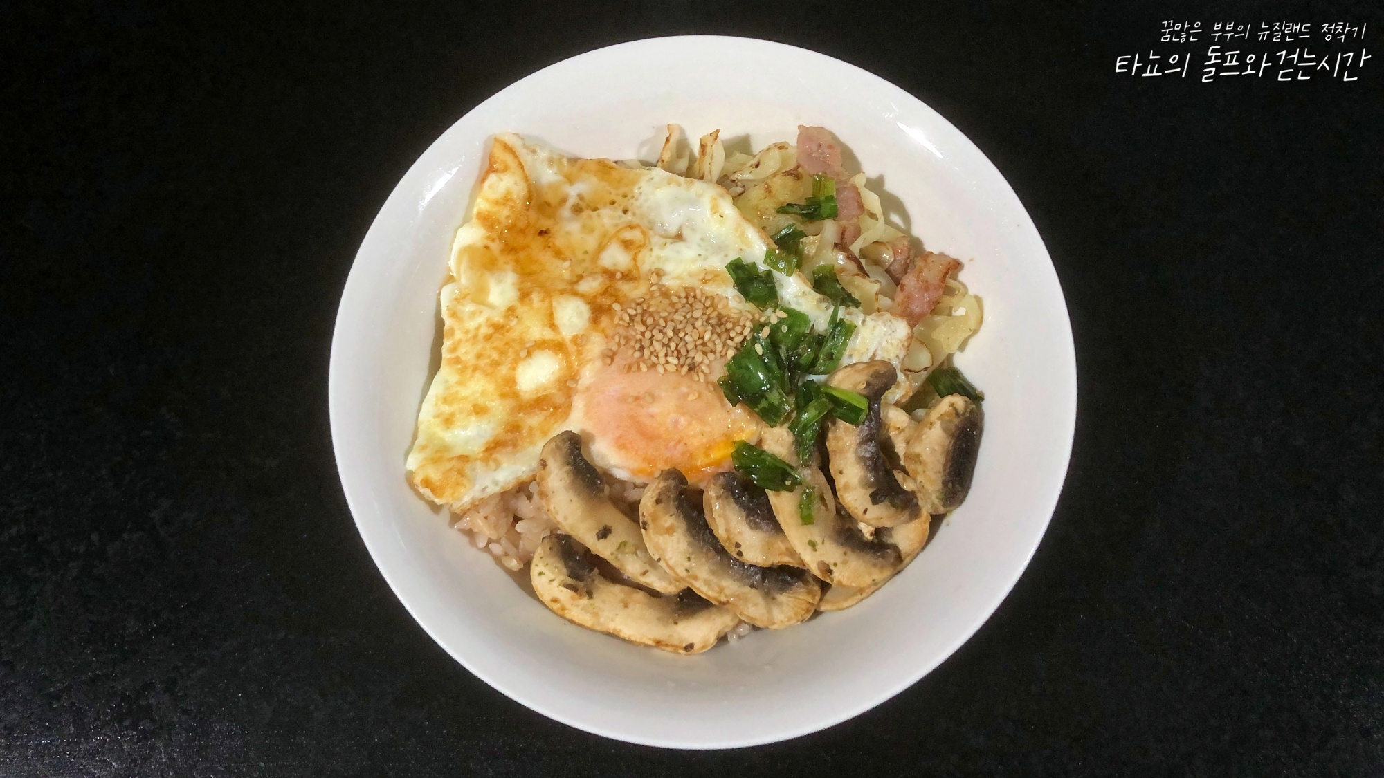 밥 위에 노릇하게 볶은 양배추와 베이컨, 구운 양송이, 파, 계란 프라이 얹어서 덮밥으로 비벼 먹었다. 신랑은 근래에 양배추 볶음이 너무 맛있다고 한다.