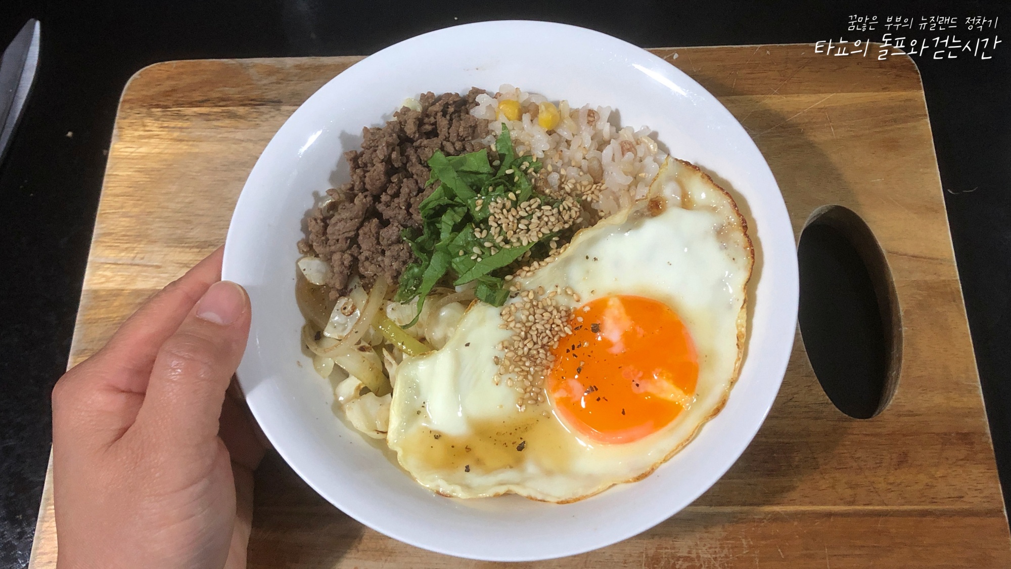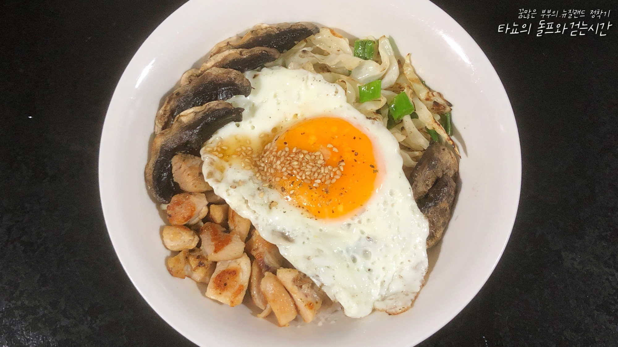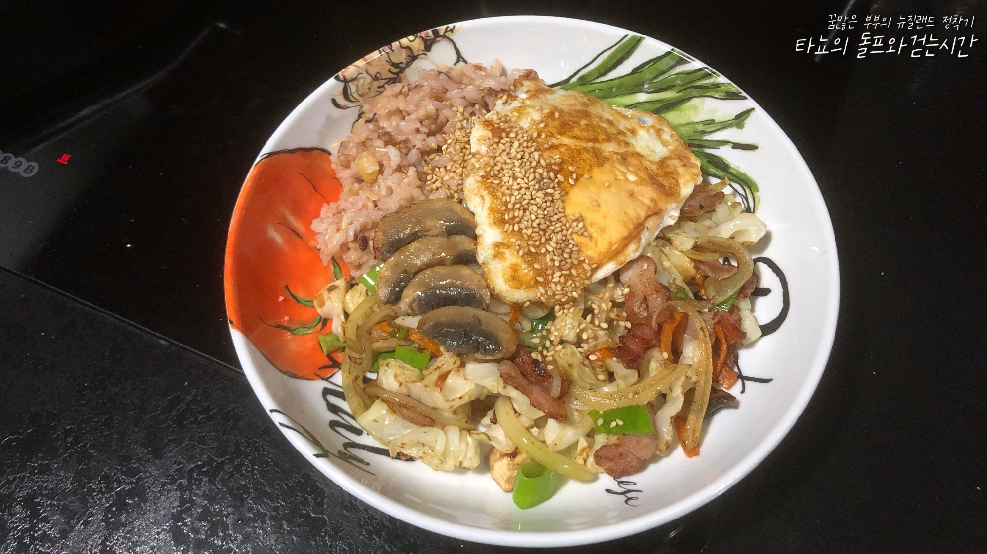 밥 위에 노릇하게 볶은 양배추와 베이컨, 구운 양송이, 파, 계란 프라이 얹어서 덮밥으로 비벼 먹었다. 신랑은 근래에 양배추 볶음이 너무 맛있다고 한다.