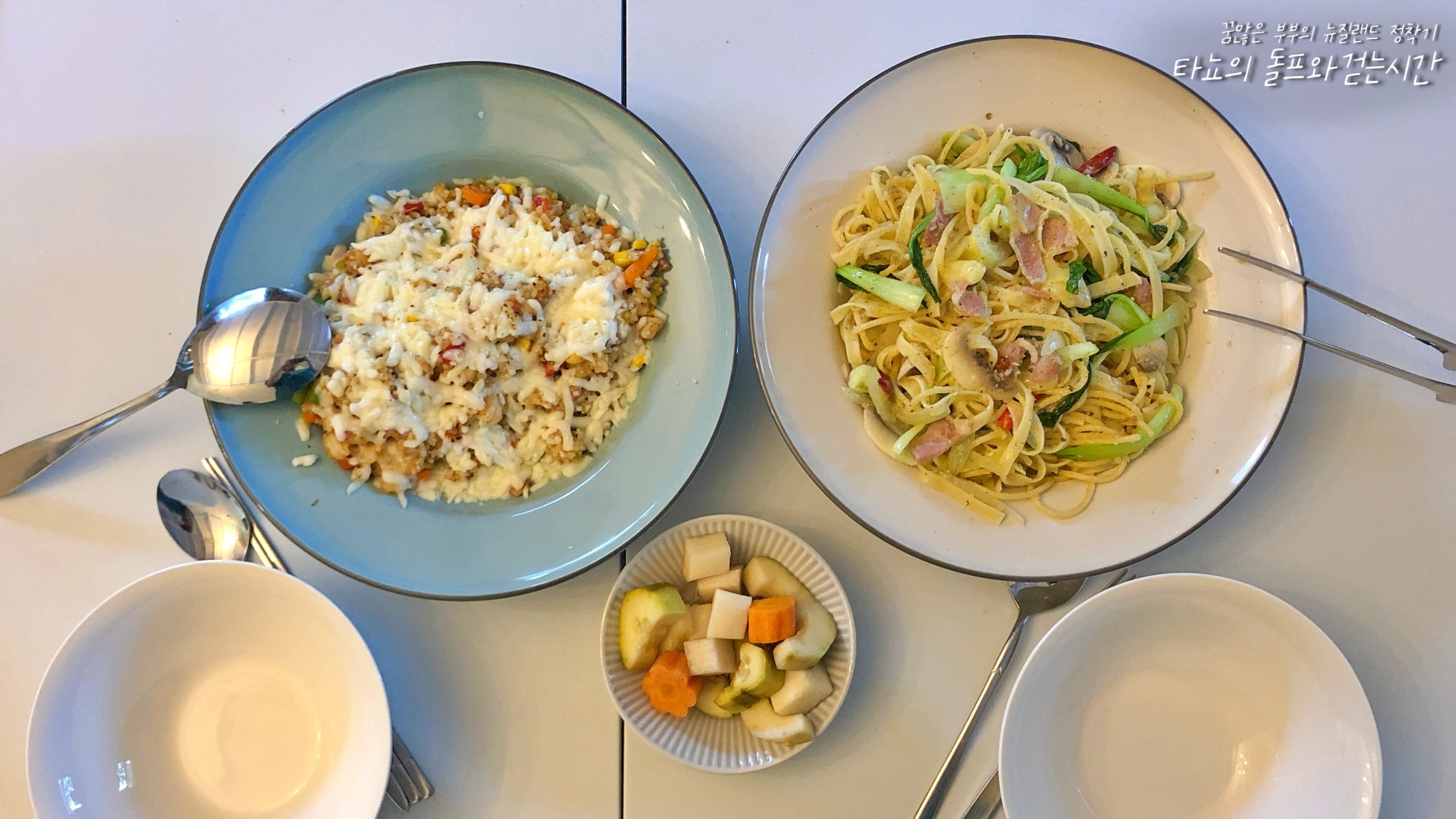 신랑이 새우를 좋아하진 않지만, 내가 좋아하니까 일단 만들었다. 그래도 비린내 나지 않게 하려고 새우를 끓는 물에 두어 번 헹궈서 사용했다. 오일 파스타에는 다진 마늘, 양송이, 베이컨, 청경채, 양파, 매운 고추 듬뿍 넣었고 야채 피클을 곁들였다.