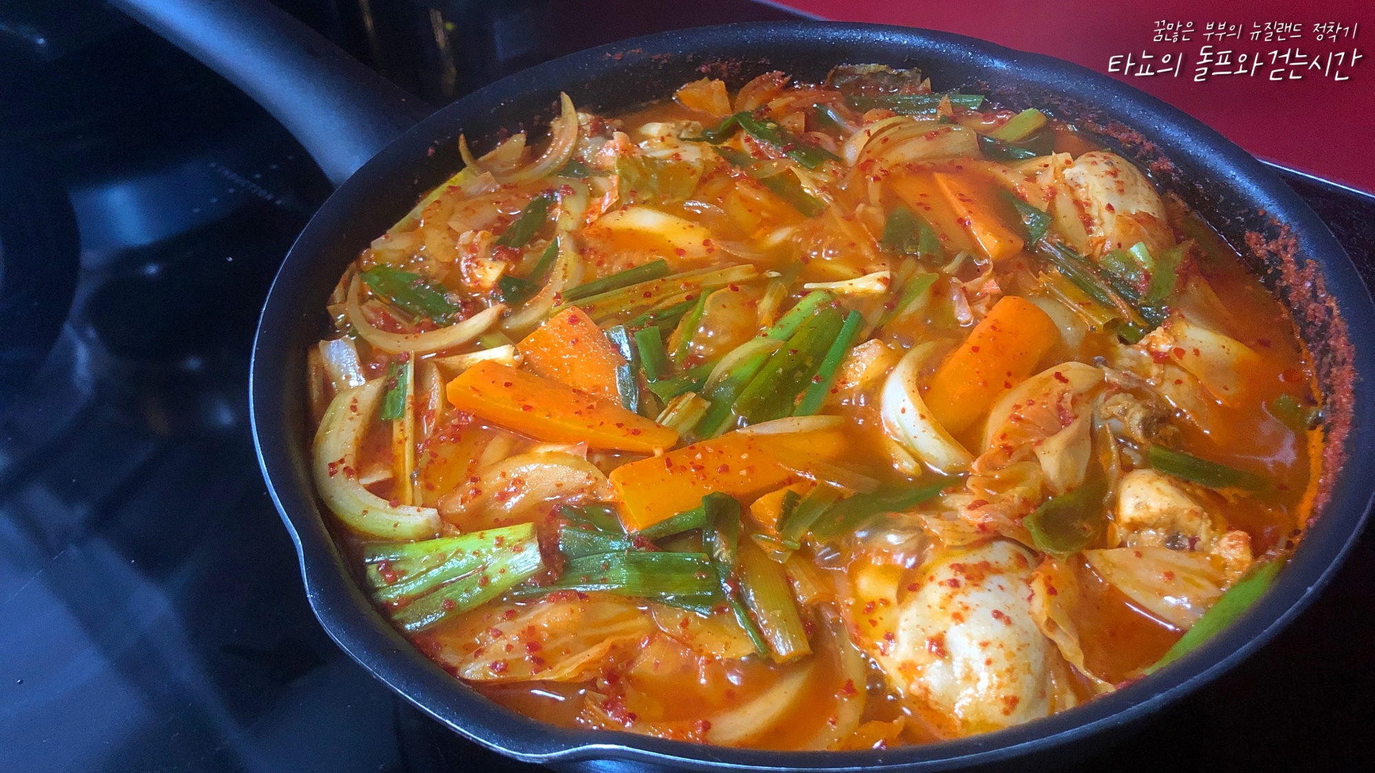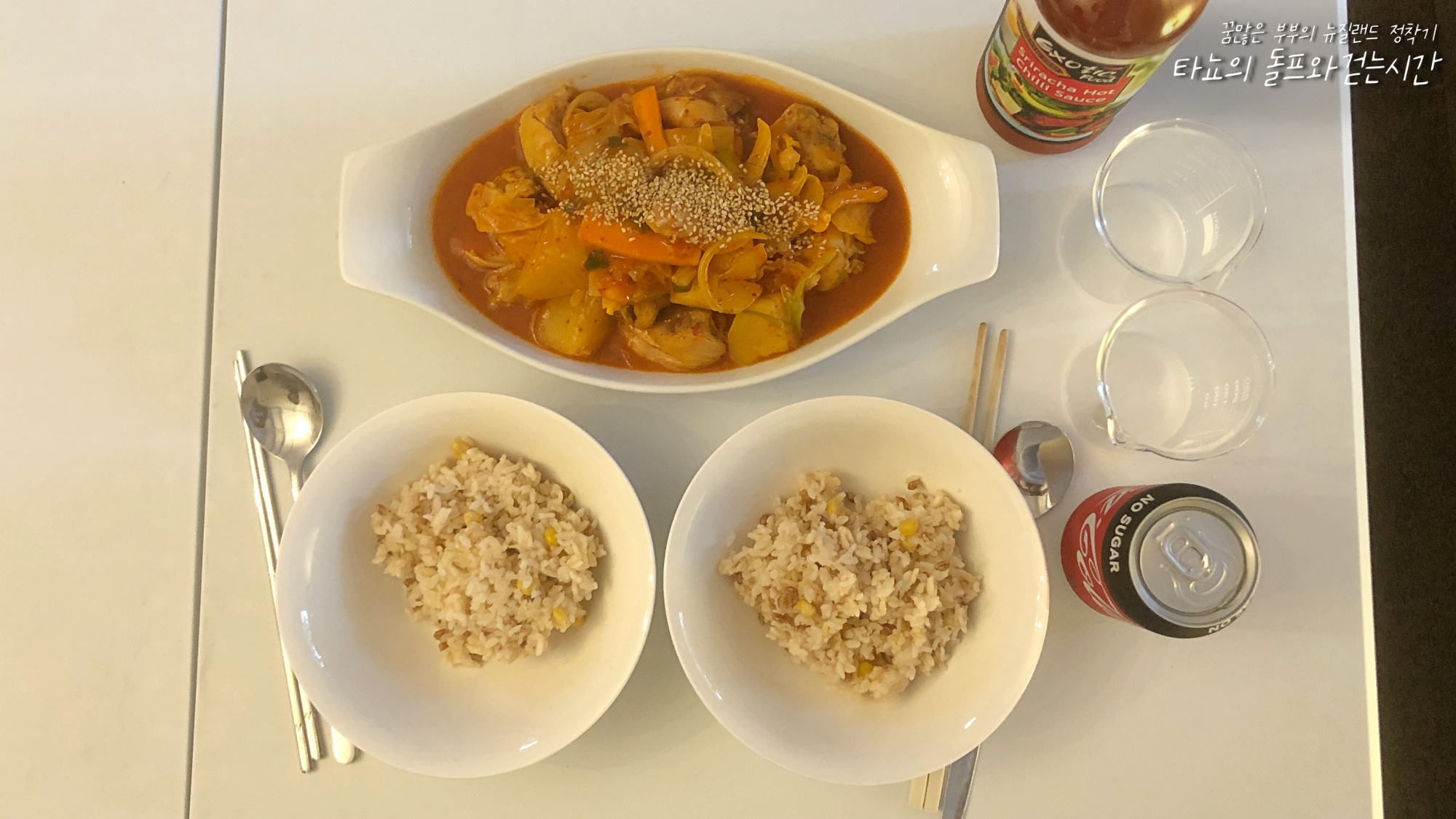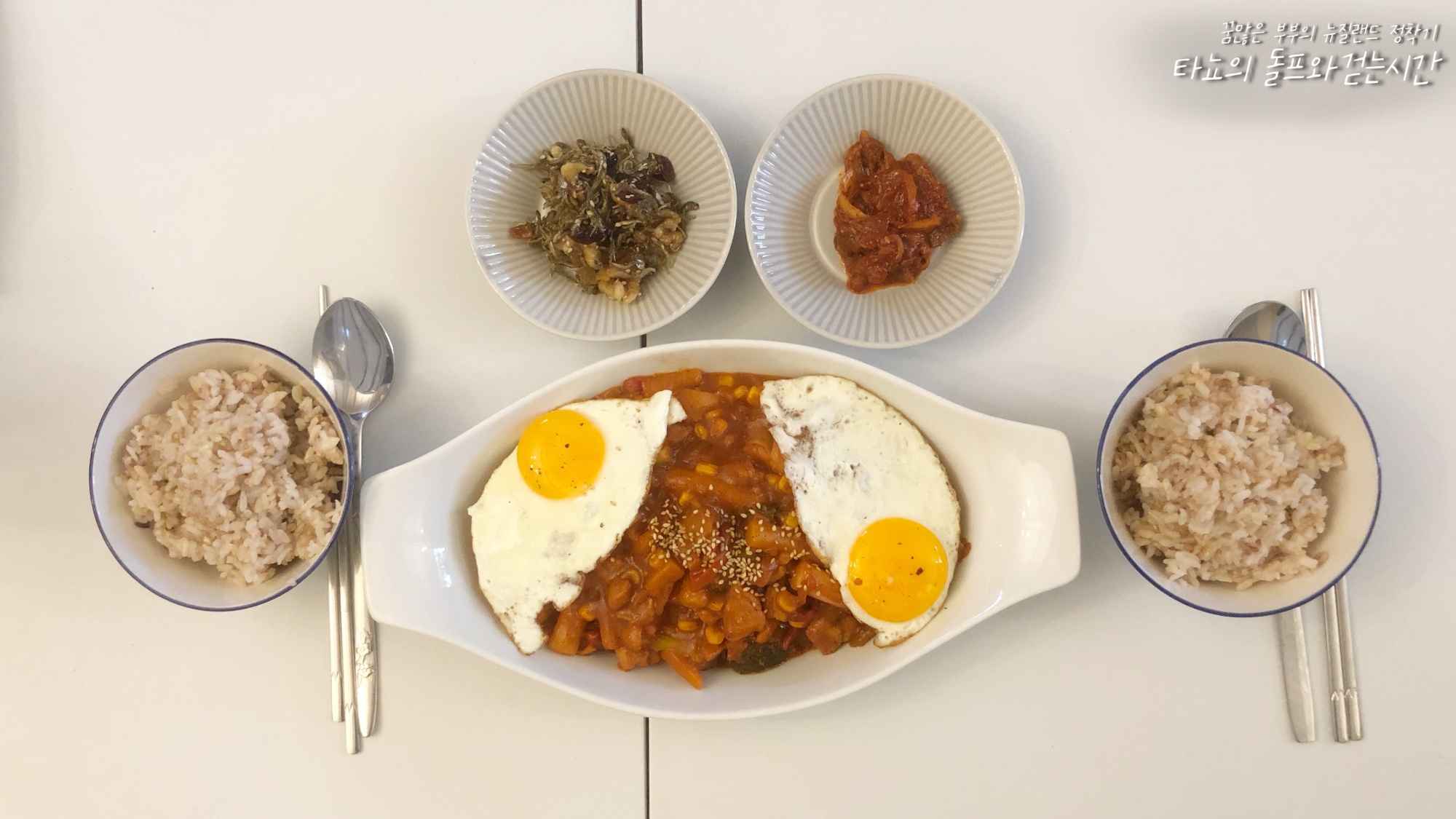신랑이 마트에서 세일 중인 버터 치킨 소스를 잔뜩 사 왔던 때가 있었다. 마침 닭고기가 있어서 냉동야채와 밀떡 넣어서 만들었다. 달걀도 구워서 올리고 멸치볶음, 김치볶음 곁들여서 맛있게 먹었지.