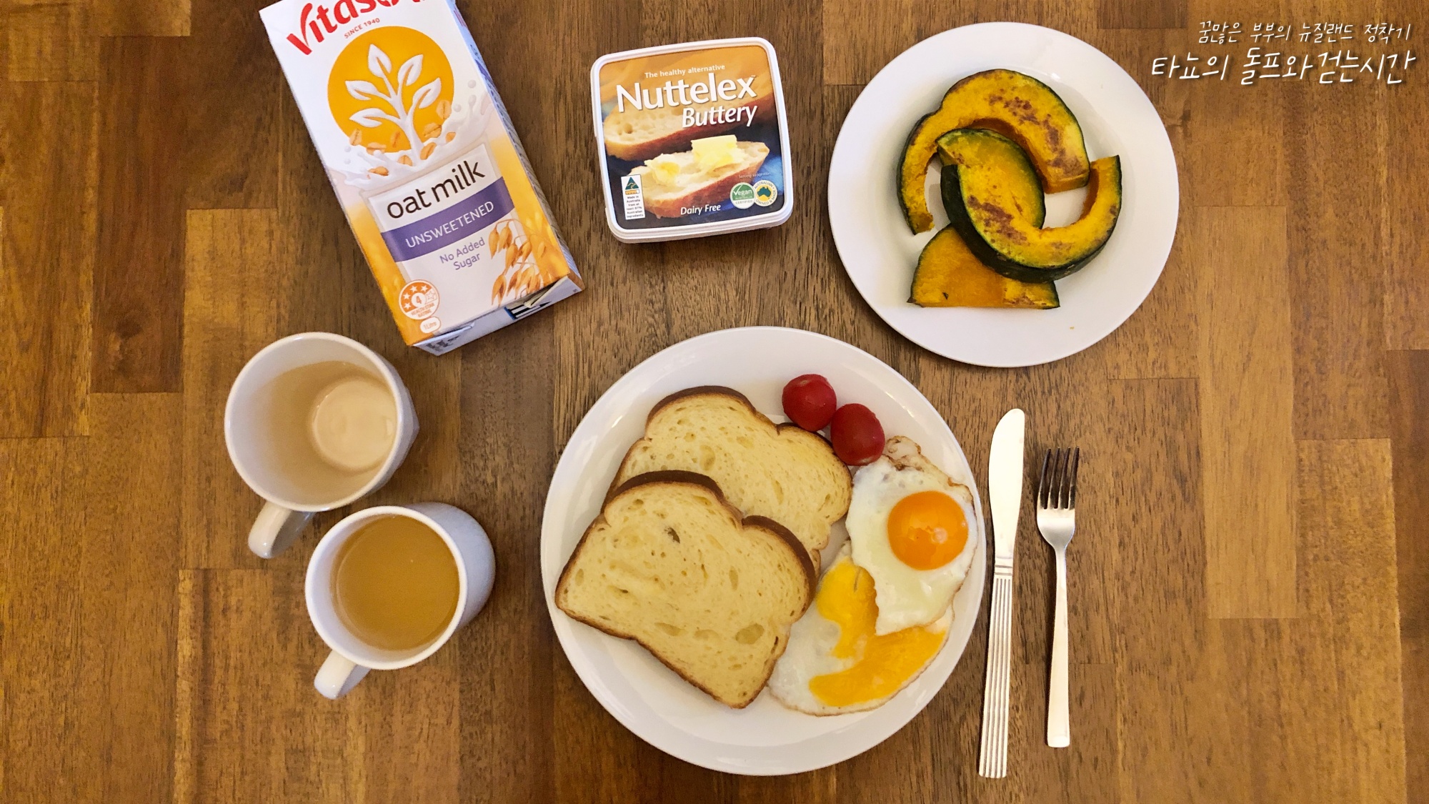 신랑 아침 식사로 준비한 토스트와 계란 프라이, 구운 단호박, 방울토마토, 오트 우유, 꿀물이다. 코로나 격리 기간 중 우리는 꿀차를 매일 마셨다. 이때부터 신랑은 격리가 끝났고 정상 출근을 시작했다.