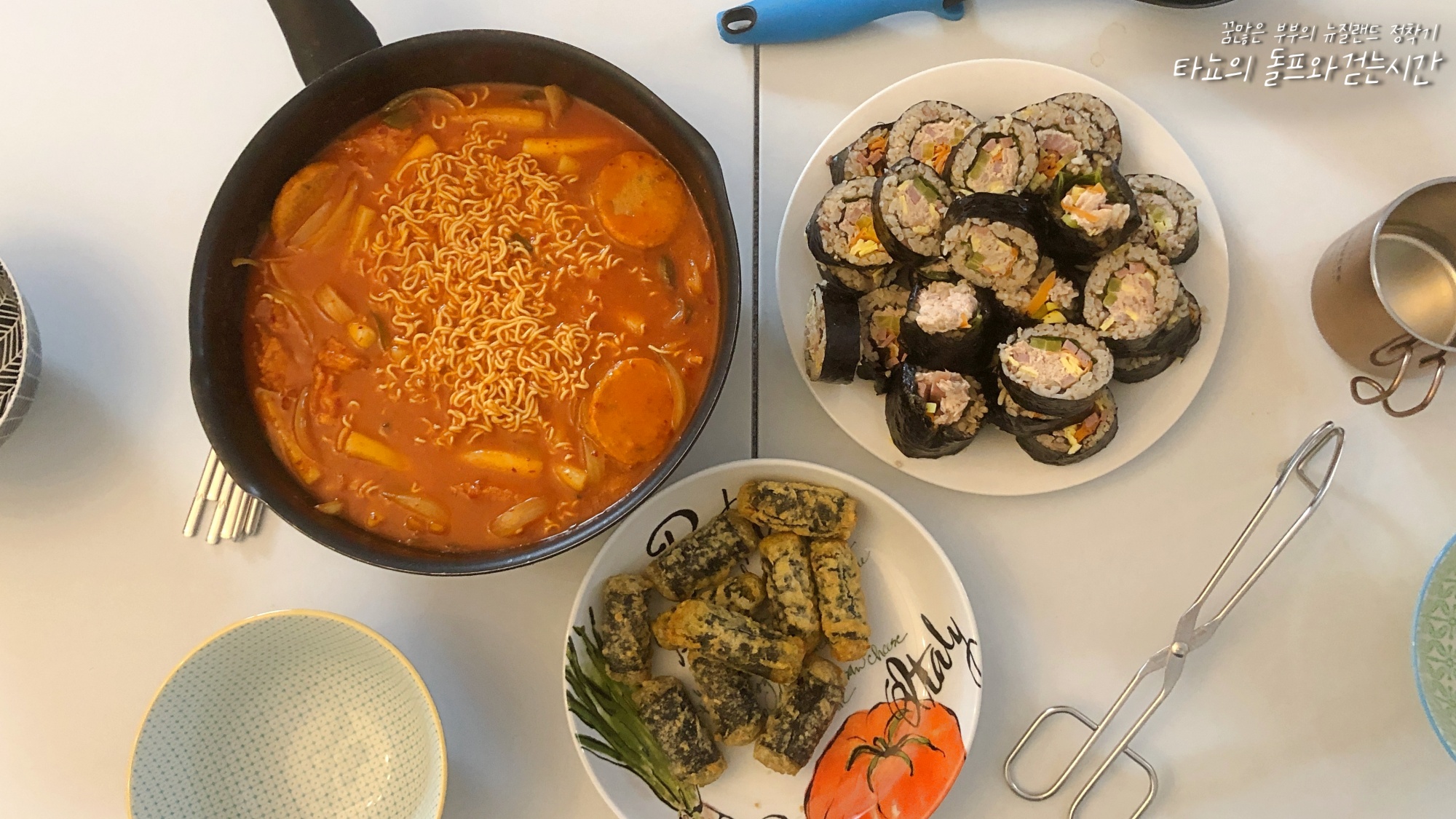 라볶이와 참치김밥, 김말이를 튀겨서 분식 파티를 했던 날이다. 김말이도 라면도 참치 통조림도 언제나 집에 구비되어 있는 재료이기에 충분히 가능했다. 내가 라볶이를 만드는 동안 플메 제이미가 참치김밥을 말았는데 당시 아픈 도중에 먹겠다는 의지로 열심히 말았던 기억이 난다.