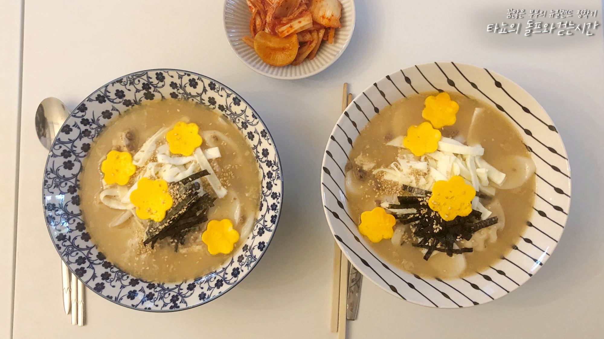 우리 집 떡돌이 신랑이 가장 좋아하는 음식 중 하나인 떡국을 끓였다. 귀찮을 때는 달걀물을 훅 부어서 휘휘 저어 끓이지만, 이날은 예쁘게 만들고 싶었다. 그래서 노른자, 흰자 나눠서 꽃 지단도 굽고 김도 잘라서 준비했다.