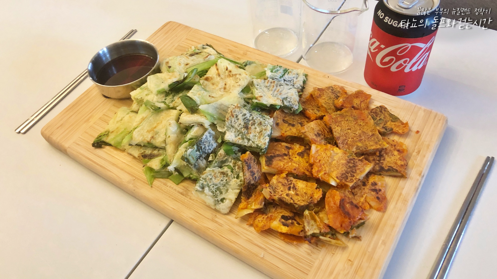 이날은 밥없이 전만 가득 구워서 먹었다. 텃밭에서 깻잎, 파, 부추를 수확한 뒤 골고루 전으로 구웠다. 모둠전인데 어찌 김치전이 빠질 수 있을까. 남은 반죽에 김치 넣어서 김치전도 만들었다. 사진에 보이는 양의 두배를 먹은 것 같다. 밥 없이도 굉장히 배가 불렀던 식사였다.