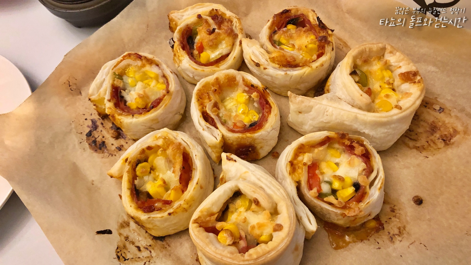 저녁으로 준비했던 피자롤이다. 페스츄리 시트에 피자 재료를 김밥 재료 올리듯 올리고 김밥처럼 말면 된다. 적당한 크기로 잘라 오븐에 구우면 맛있는 피자롤 완성.