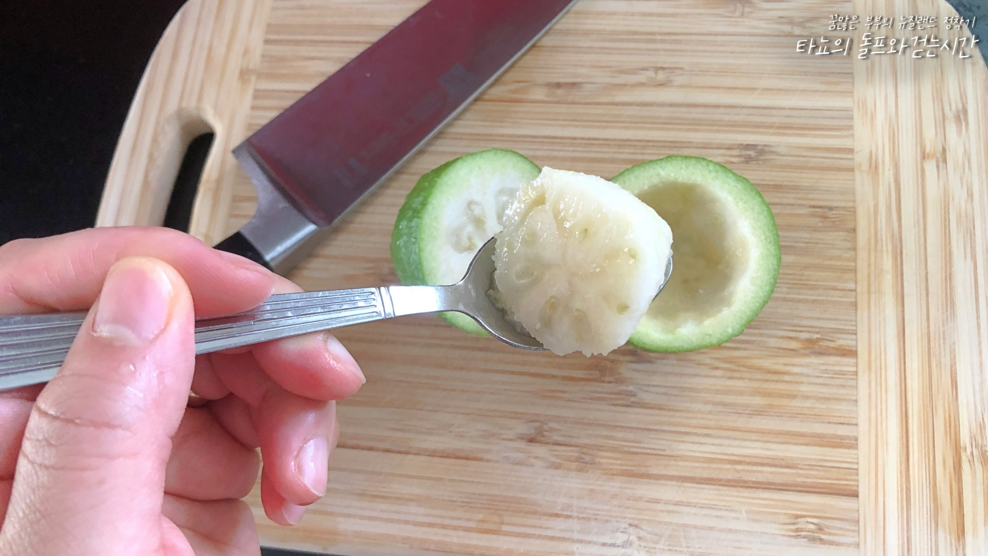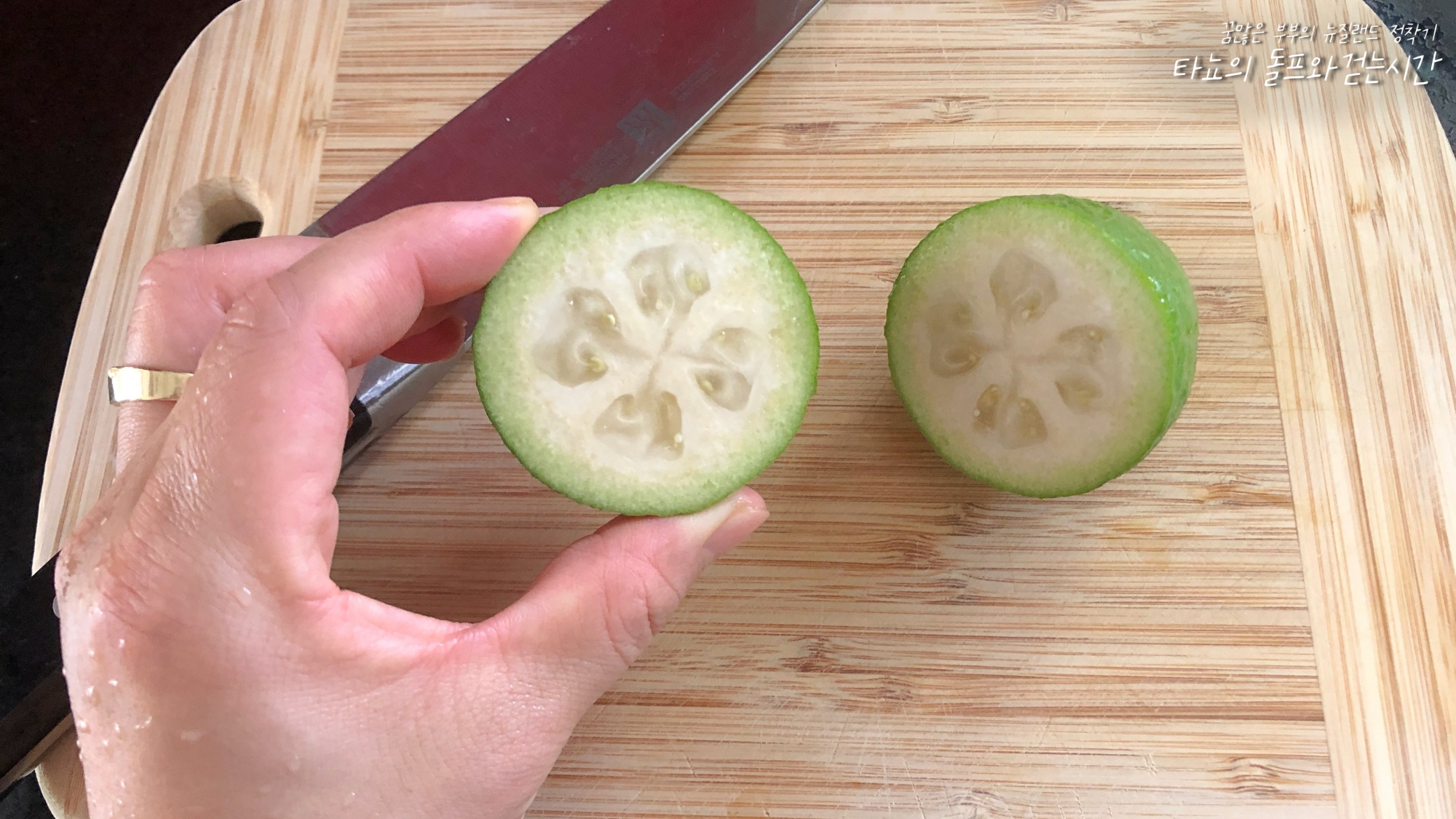 피조아를 반으로 자른 모습이다. 사진처럼 숟가락으로 속을 파먹으면 되는데 처음에 그리도 싫었던 피조아가 참 맛있는 요즘이다.