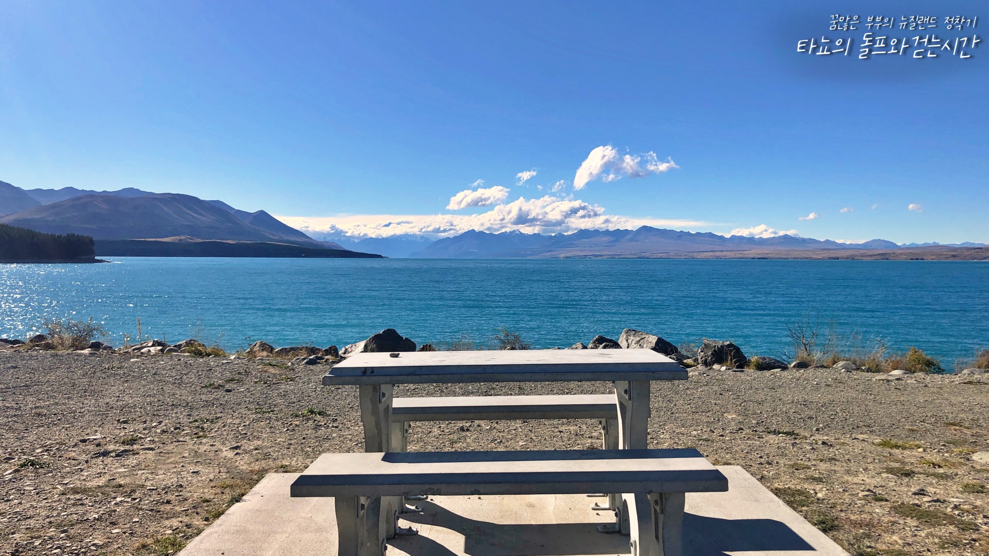 테카포 호수 어느 벤치에 앉아 신랑과 점심을 먹었다. 푸카키 호수에 갔다가 돌아오는 길에 테카포에 들렀는데 노을지는 모습이 참 아름다웠다. 왕복 6시간, 주말에 당일치기로 가기에는 약간 부담스러운 거리였지만, 오랜만에 아름다운 만년설과 호수를 보고 오니 마음이 참 시원하고 좋았다.