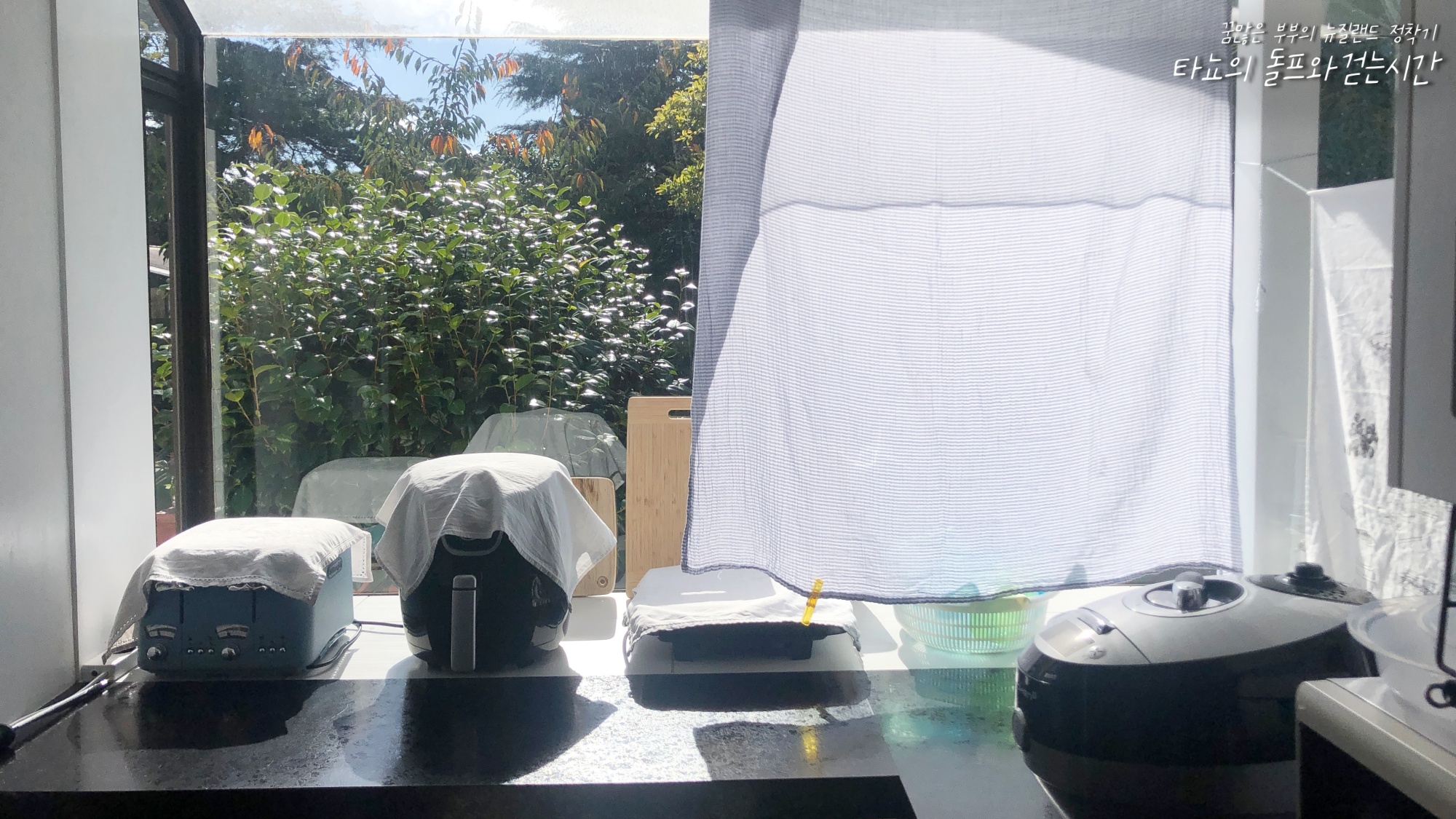 간만에 날씨가 좋다. 날이 좋은 날에는 주방에 햇살이 너무 좋은데 마침 그 자리가 밥솥이 있는 곳이었다. 콘센트 위치상 밥솥의 자리를 옮길 수는 없어서 남는 린넨으로 작은 커텐을 만들었다. 소형 주방 가전들이 자리할 곳은 저기 뿐인데, 햇빛에 타격을 입을 것 같아서 모두 린넨을 덮어서 보관하고 있다.
