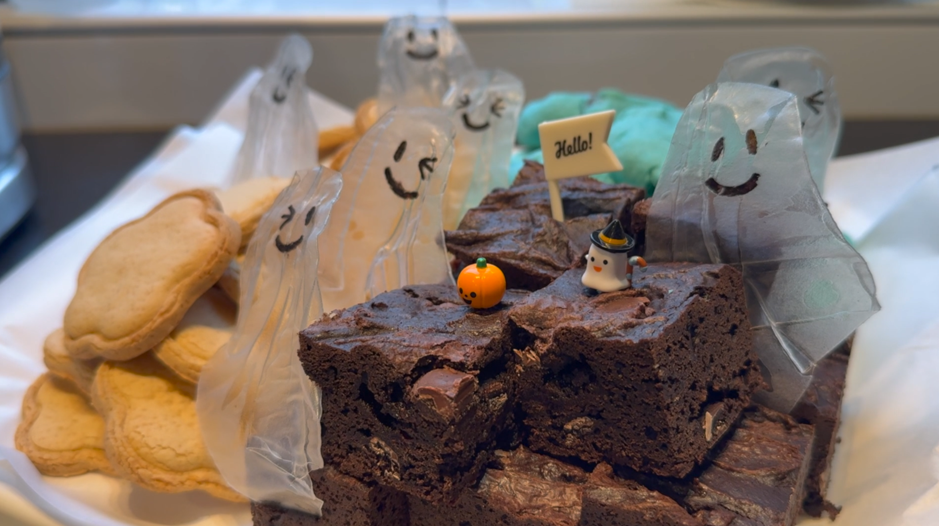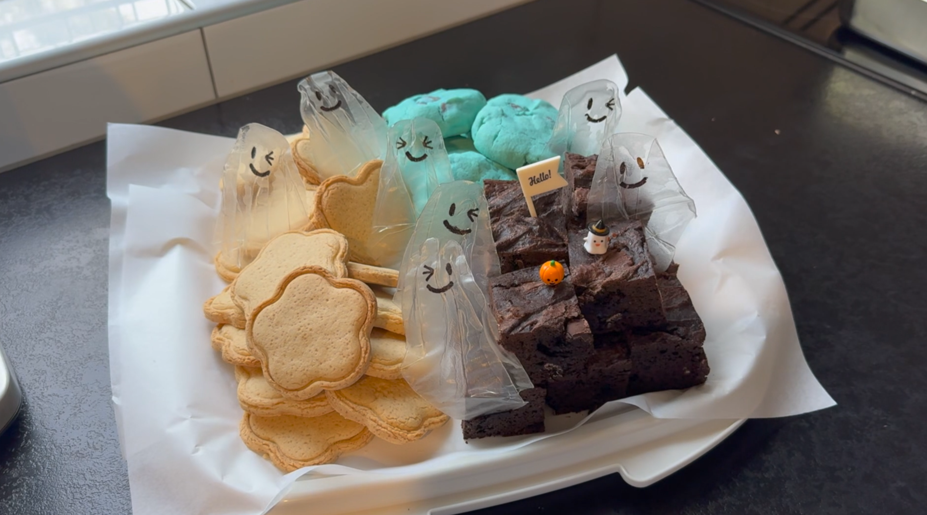 사무실 직원 중에는 글루텐 프리가 있다. 이런 경우 모든 밀가루는 아웃이다. 매번 무조건 글루텐 프리 베이킹만 준비하는 편은 아니지만, 그래도 최대한 배려해서 글루텐 프리도 함께 준비하려고 노력한다. 하지만 이번 할로윈핼러윈 간식은 모두 100% 글루텐 프리로 준비했었다. 글루텐 프리 밀가루로 만든 르뱅쿠키와 초코칩 브라우니, 쌀가루로 만든 사브레이다. 핼러윈 느낌을 내려고 르뱅쿠키는 기괴한 파란색으로, 라이스페이퍼를 활용해 유령도 만들었었다.