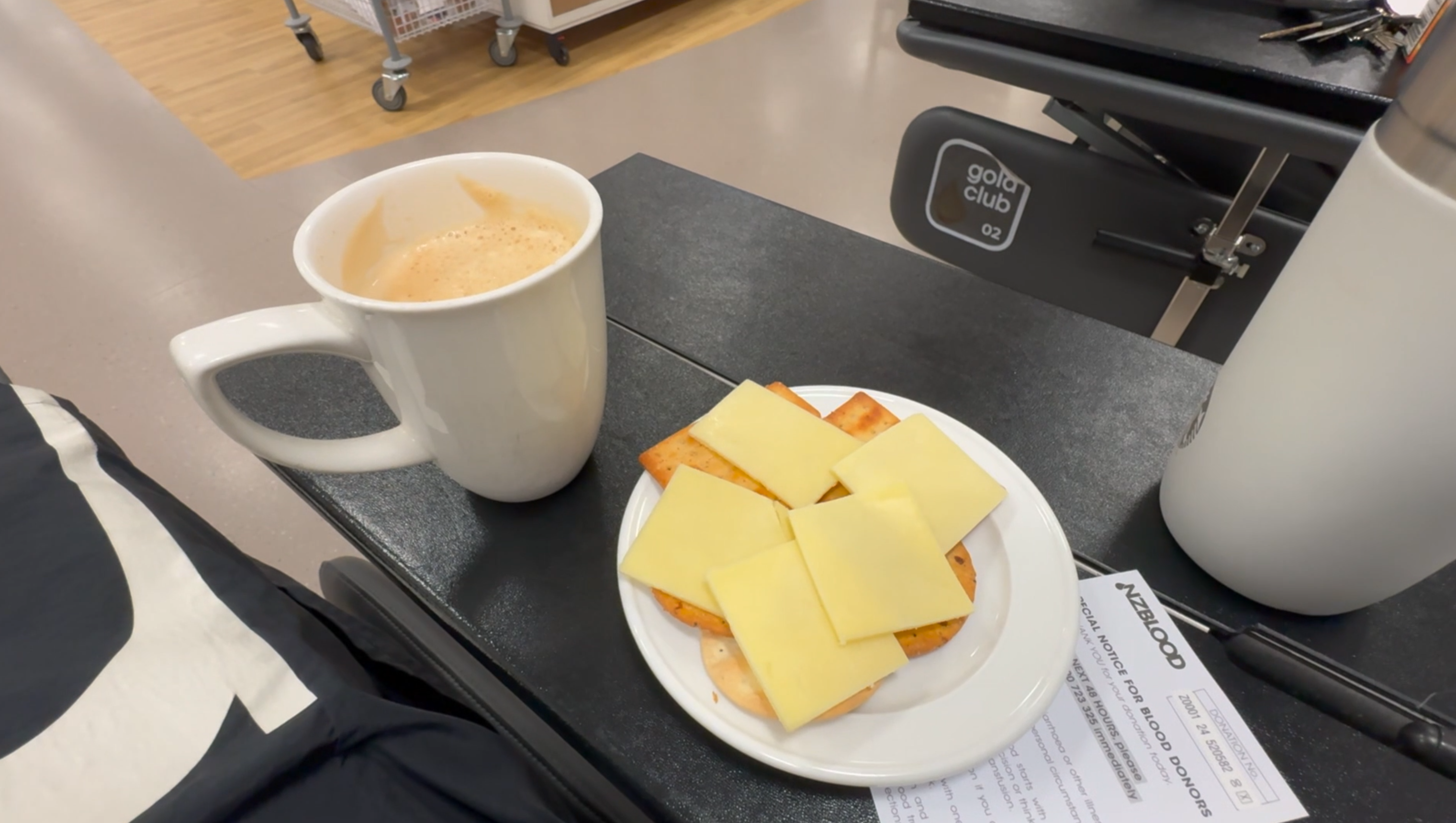 헌혈하는 동안 먹었던 간식이다. 일단 헌혈이 시작되면 보통 간호사들이 곧장 뭘 먹을지 물어본다. 일반적으로 치즈와 크래커, 달콤한 비스킷류, 티와 커피, 주스, 물 정도이다. 생각보다 여기 플랫화이트가 맛이 괜찮다.